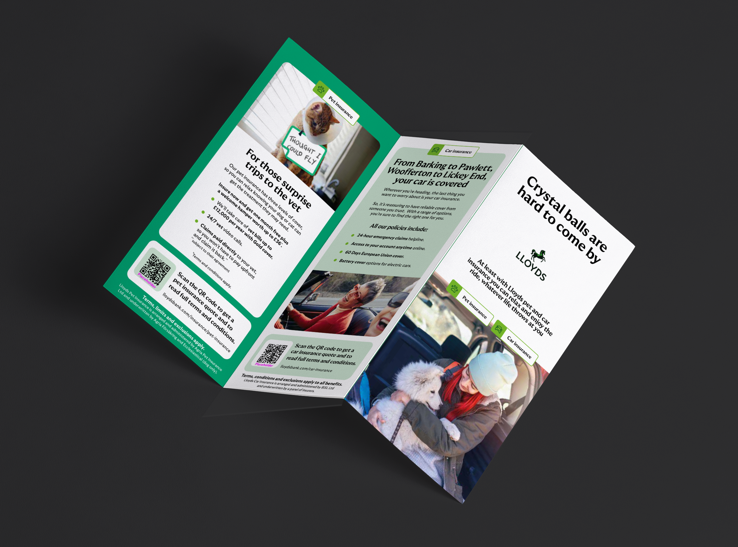 When tasked with creating a combined leaflet for both pet and car insurance, we added even more humour - and were proud to get the words 'Lickey End' into a headline (yes it is a real place, a village in Worcestershire).